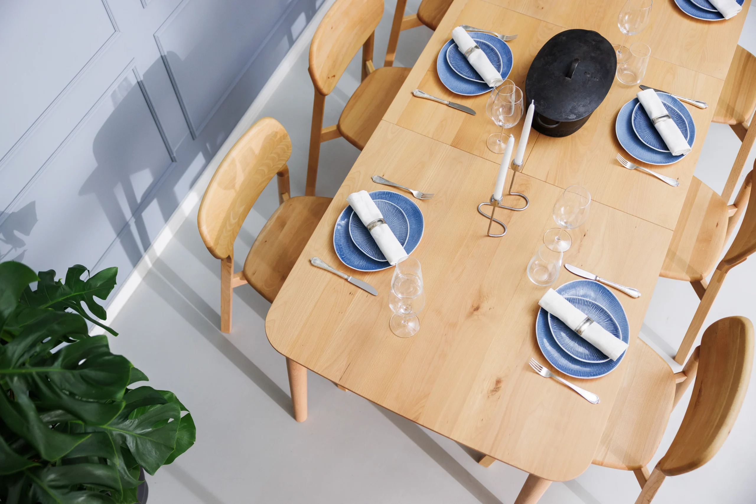 Der Tischauszug befindet sich in der Tischmitte und besteht aus zwei Massivholzplatten. Die Erweiterungsplatten haben eingefräste Griffe, wodurch sie sich von einer Person leicht ausklappen lassen. Auch im ausgefahrenen Zustand büßt der Tisch nicht an Stabilität und Standfestigkeit ein.