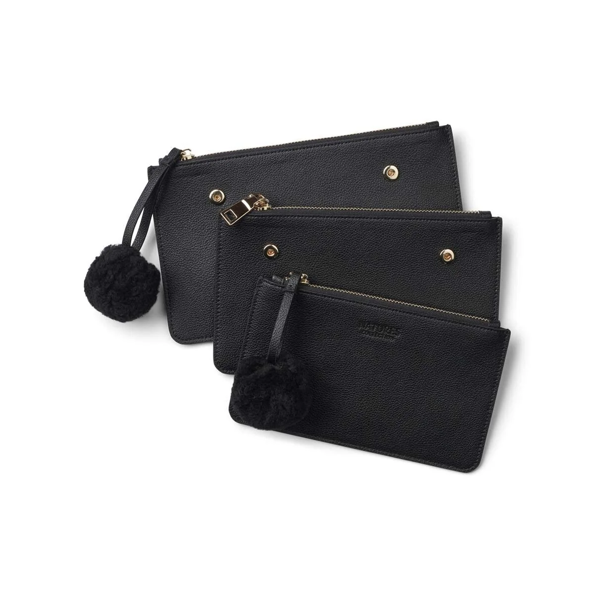 Camilla ist ein wahres Multitalent. Sie besteht aus drei separaten Clutches, die mit praktischen Druckknöpfen mühelos zusammengefügt werden können. Jede Clutch verfügt über einen Reißverschluss mit einem bezaubernden Pompon aus Lammwolle als charmantes Detail.