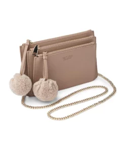 Camilla ist ein wahres Multitalent. Sie besteht aus drei separaten Clutches, die mit praktischen Druckknöpfen mühelos zusammengefügt werden können. Jede Clutch verfügt über einen Reißverschluss mit einem bezaubernden Pompon aus Lammwolle als charmantes Detail.