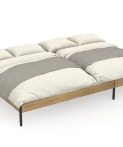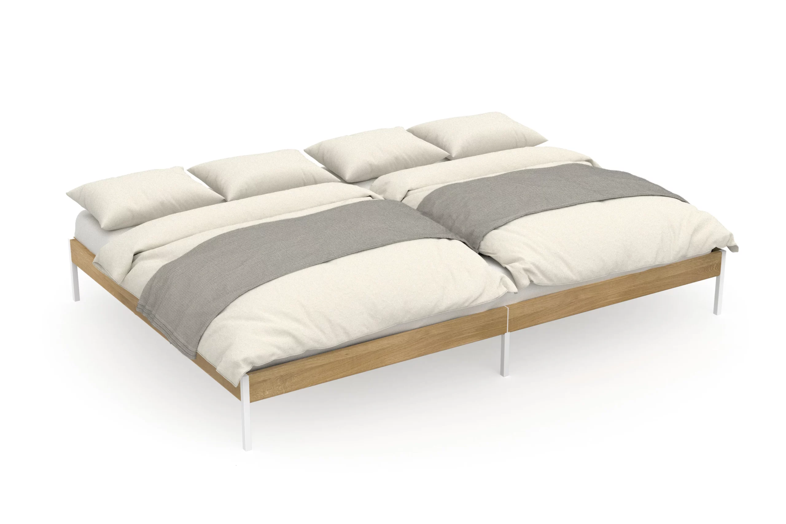Das Familienbett basiert auf der bewährten Luna Bett-Konstruktion und ist dank stabiler Beine aus weiß oder schwarz beschichtetem Stahl in Kombination mit edlem Eichenholz sehr schlicht. Die Matratze liegt bei diesem Plattformbett direkt oben auf, so dass es nicht wuchtig erscheint und es trotzdem eine angenehme Komforthöhe erreicht. Der Holzrahmen wird an der Unterkante weich abgerundet.