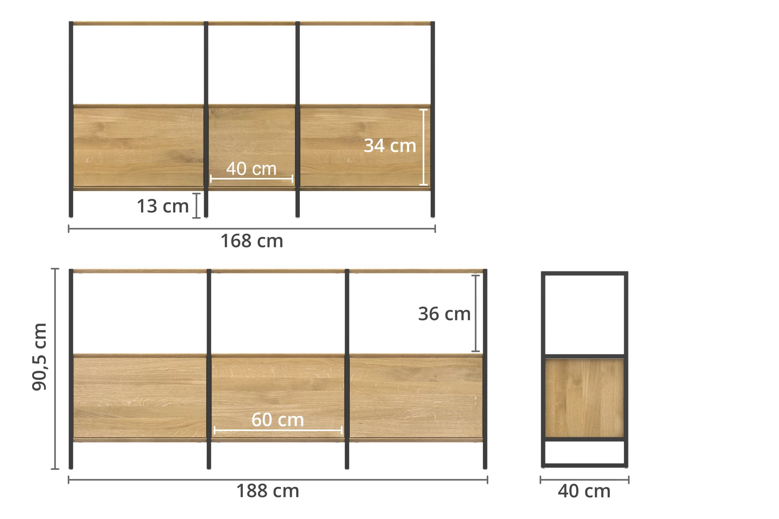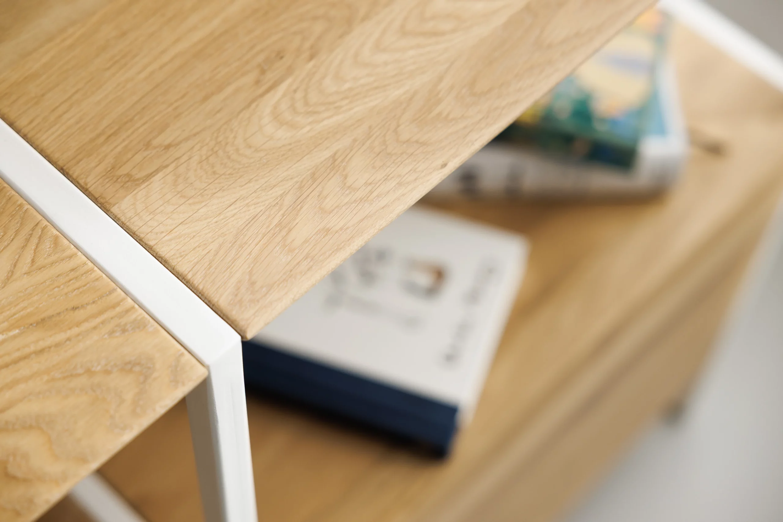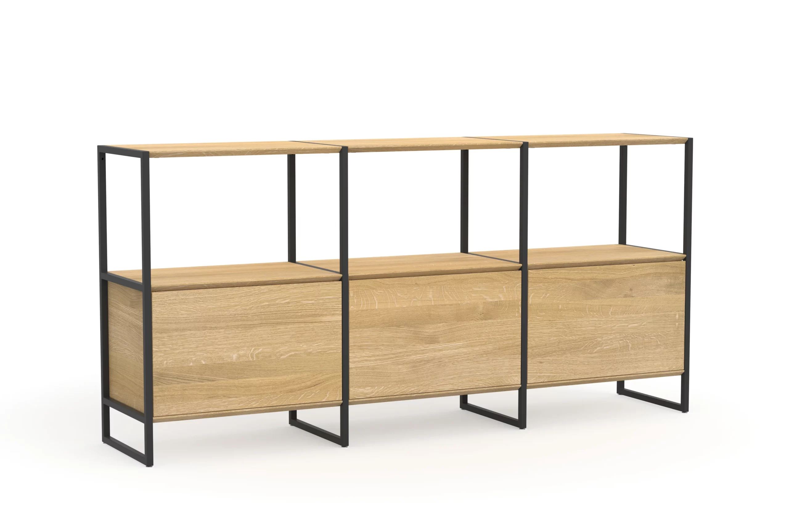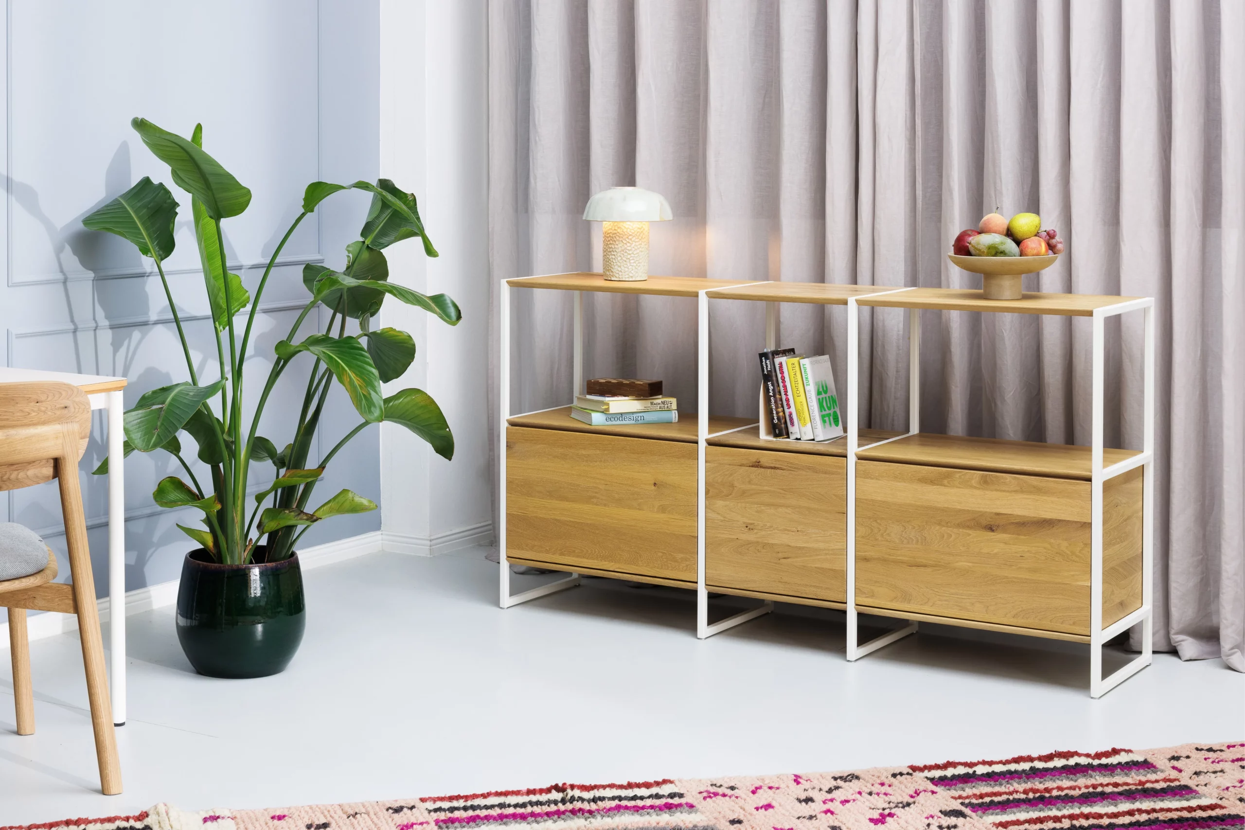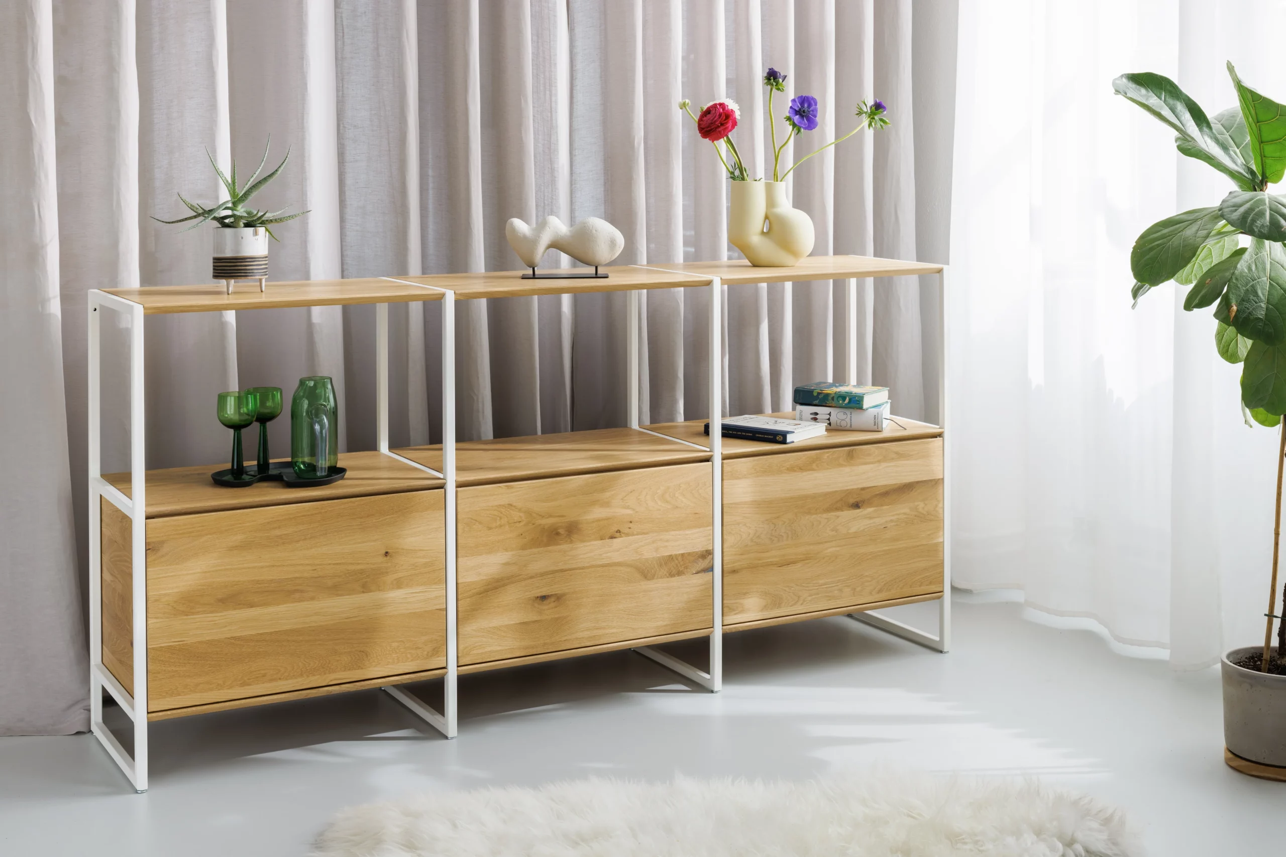 Durch den schlanken Rahmen und Regalen in zwei Breiten 60 oder 40 cm mit schmal gefrästen Kanten kommt Wega sehr stilvoll daher. Dank des Rahmens aus pulverbeschichtetem Stahl benötigt das Sideboard weniger Material und ist trotzdem äußerst stabil. Dezente verstellbare Füße gleichen Unebenheiten im Boden aus.