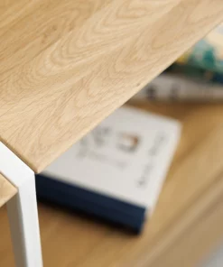 Alle Holzteile sind aus massiver sorgfältig selektierter Eiche und werden mit einem ökologischen Möbelöl aus natürlichen Rohstoffen behandelt. Ein kleiner Anteil von Weiß-Pigment hellt die Eiche leicht auf, als wäre sie gerade frisch geschnitten.