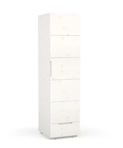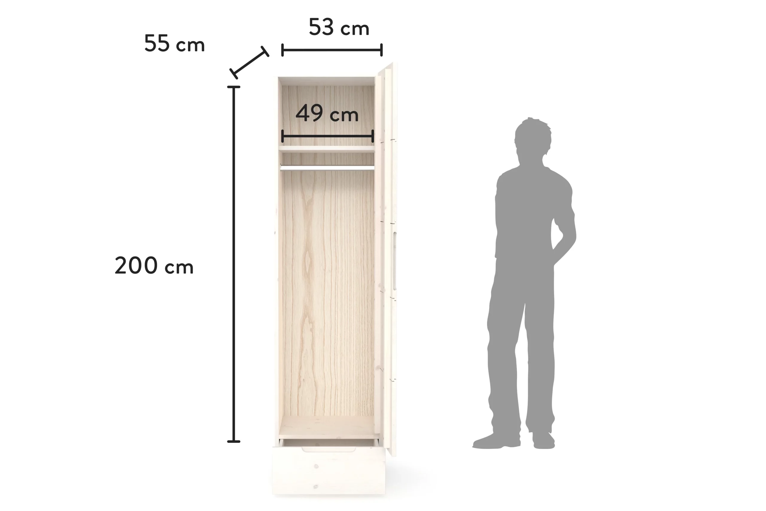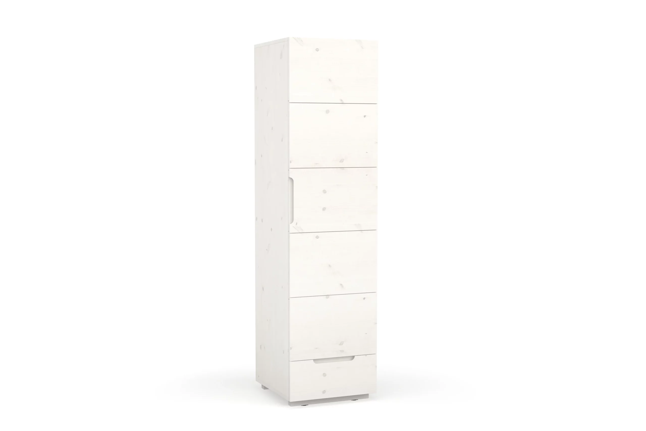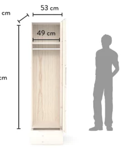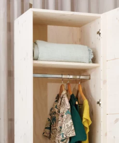 Der Kleiderschrank Enorm S hat ein großes Abteil mit Kleiderstange und zwei großen Ablageflächen. Durch die Schublade kannst du deine Kleidung auch im Fußbereich noch komfortabel erreichen. Bei den Schubladen-Führungen und Scharnieren verwenden wir Qualitäts-Komponenten der Firma Haefele, die sich selbstständig lautlos und sanft zuziehen (Soft-Close). Der Kleiderschrank Enorm S ist die perfekte Erweiterung für Enorm M, kann aber auch allein aufgestellt werden.