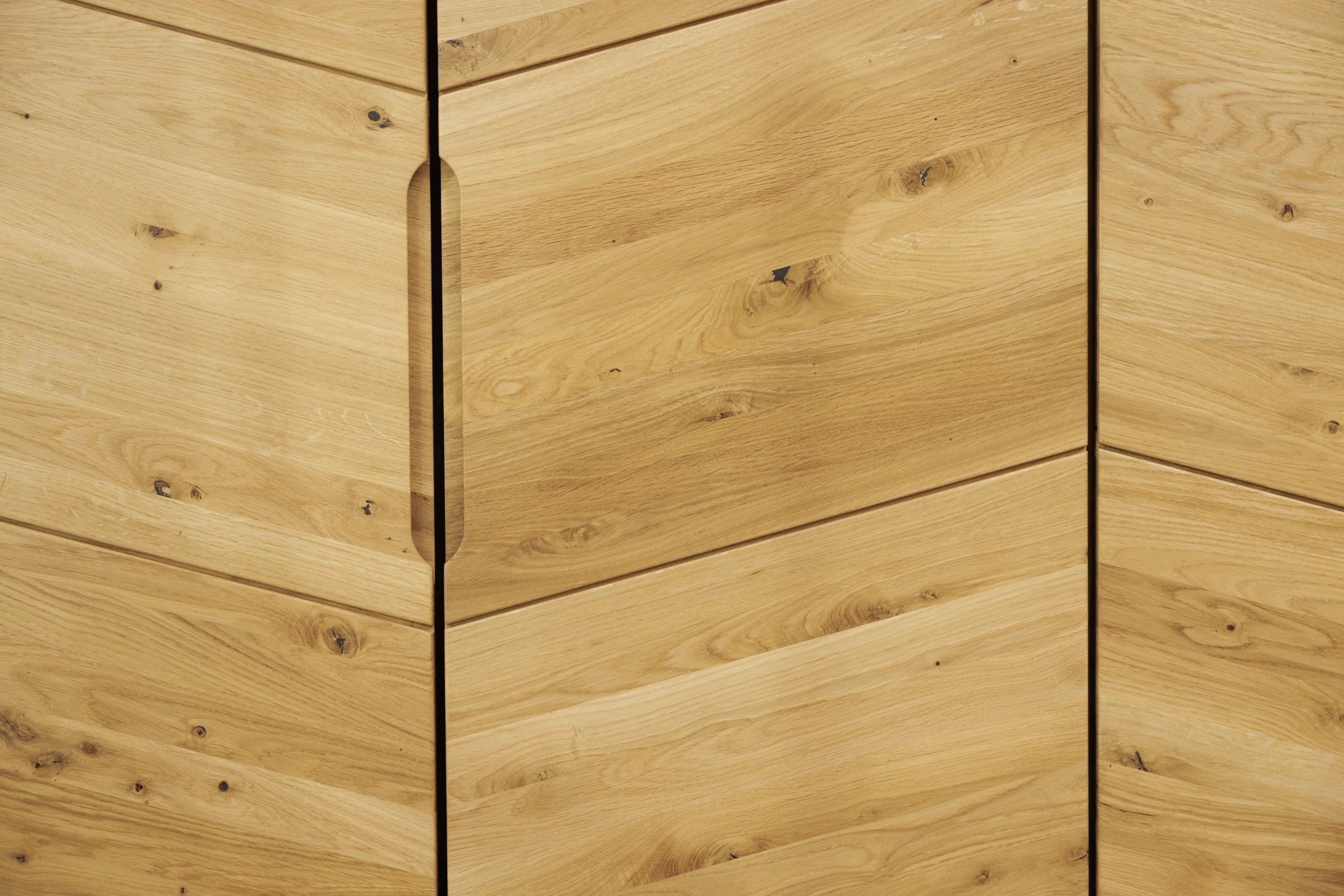Die schräg geschnittenen Türen geben dem Schrank ein markantes Erscheinungsbild und verhindern zudem ein Verziehen der Massivholz-Türen. Sie lassen sich komfortable justieren und schließen sanft per Soft-Close. Du kannst die Türen in beide Richtungen montieren.