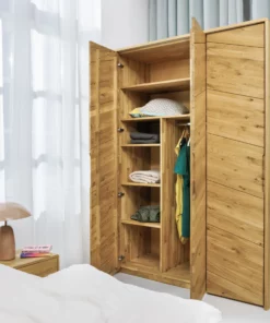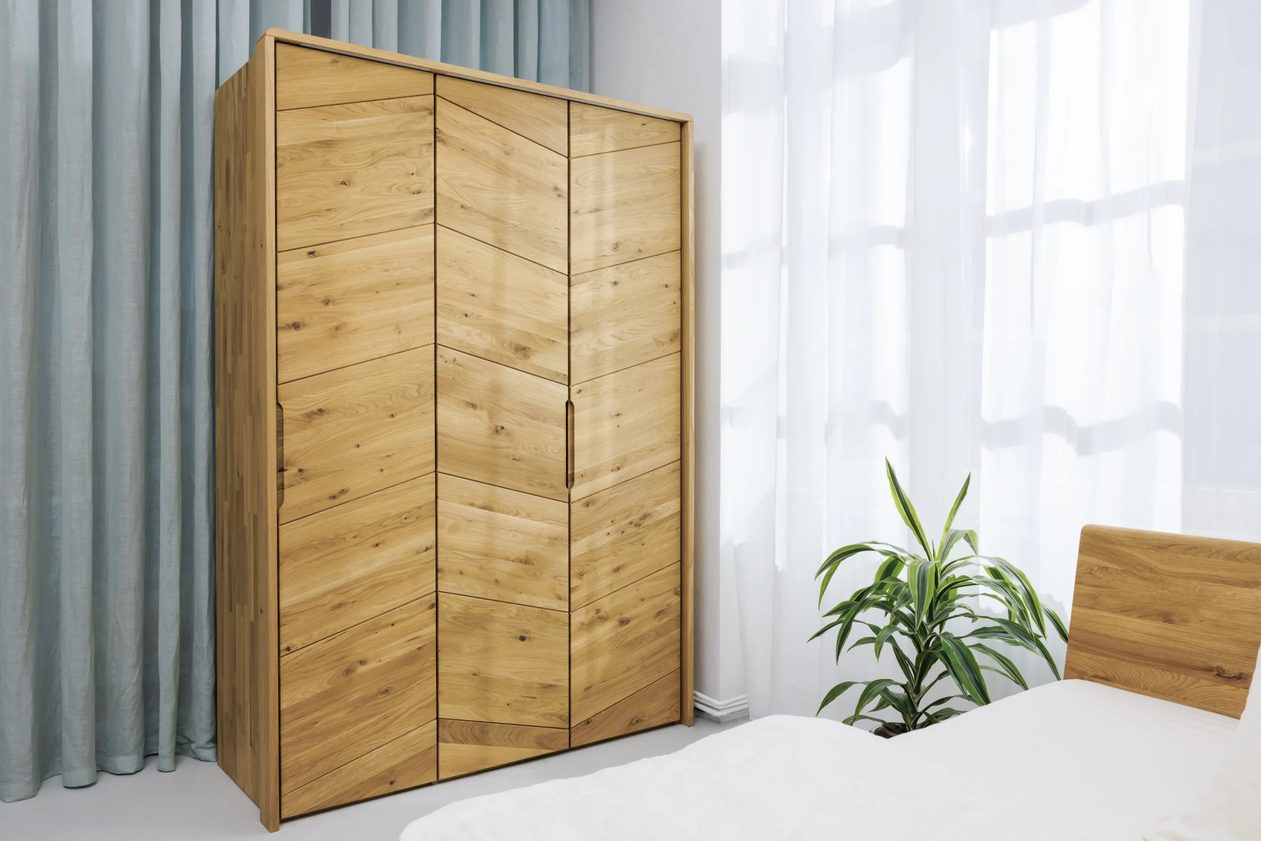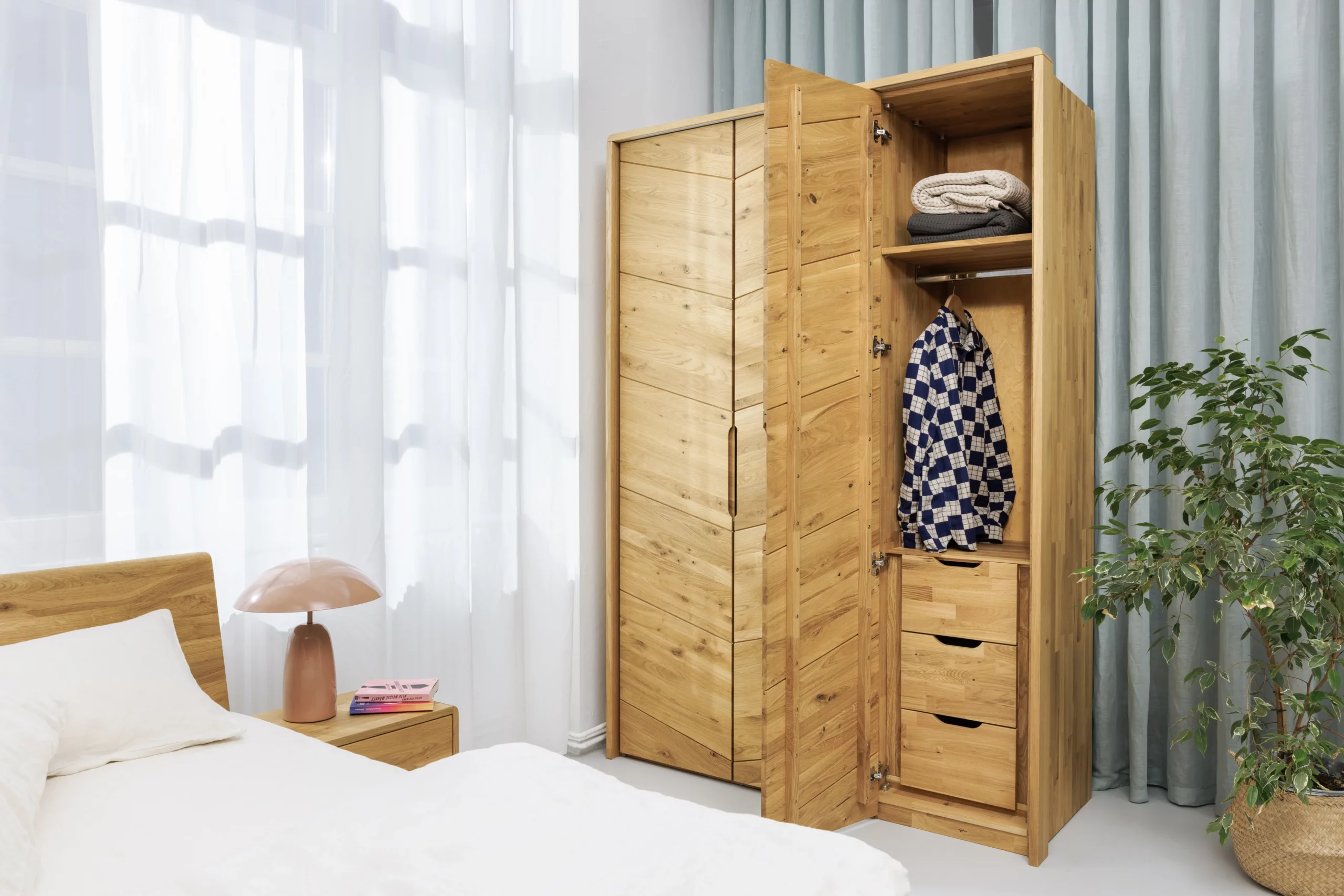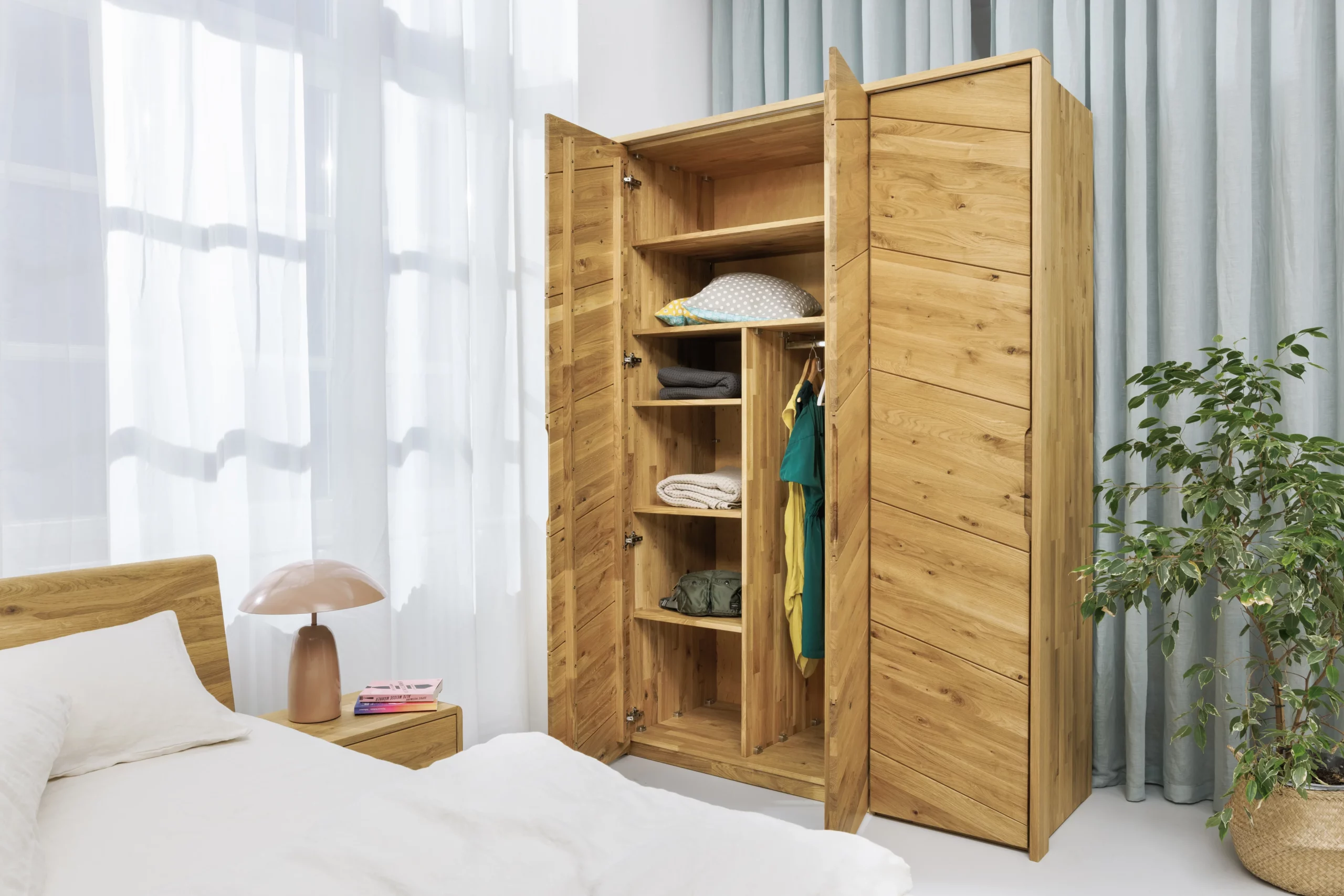 Der Kleiderschrank Prenzlauer Berg aus handverlesener Wildeiche ist ein Traum für jedes Schlafzimmer. Der Schrank wird komplett aus zertifiziertem Massivholz gefertigt und nur mit hochwertigen Verbindungselementen ausgestattet. Die Wildeiche wird ökologisch geölt und ist damit widerstandsfähig gegen Wasser und Schmutz. Zugleich kann das Holz weiter atmen und verbessert so das Raumklima.