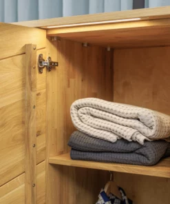Die schräg geschnittenen Türen geben dem Schrank ein markantes Erscheinungsbild und verhindern zudem ein Verziehen der Massivholz-Türen. Sie lassen sich komfortable justieren und schließen sanft per Soft-Close. Du kannst die Türen in beide Richtungen montieren.