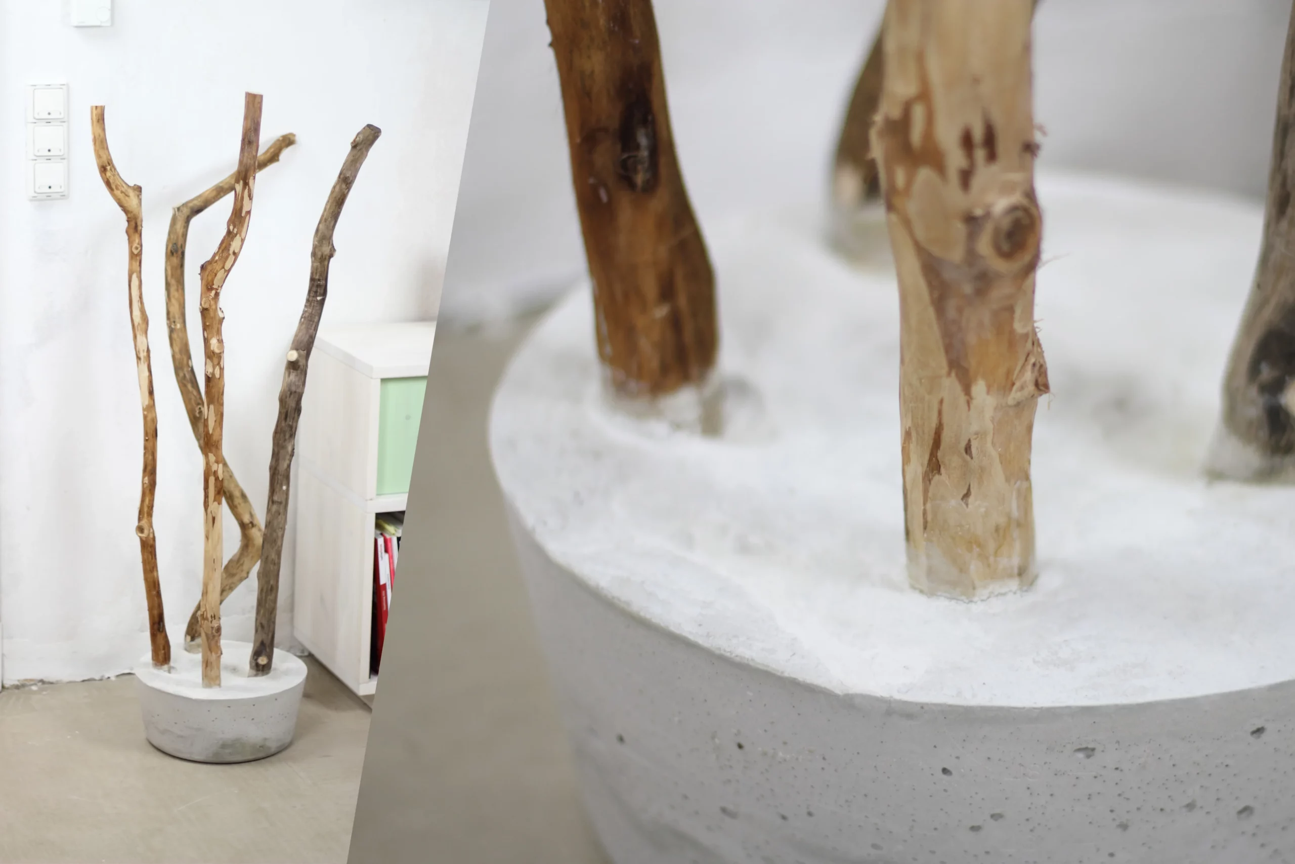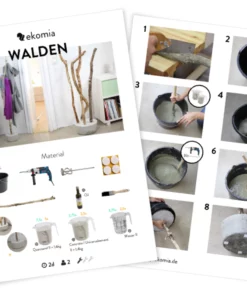 Der Bau des Kleiderständers Walden ist denkbar einfach. Du benötigst nur einen oder mehrere Äste, die gut als Garderobe herhalten und einen Eimer.