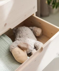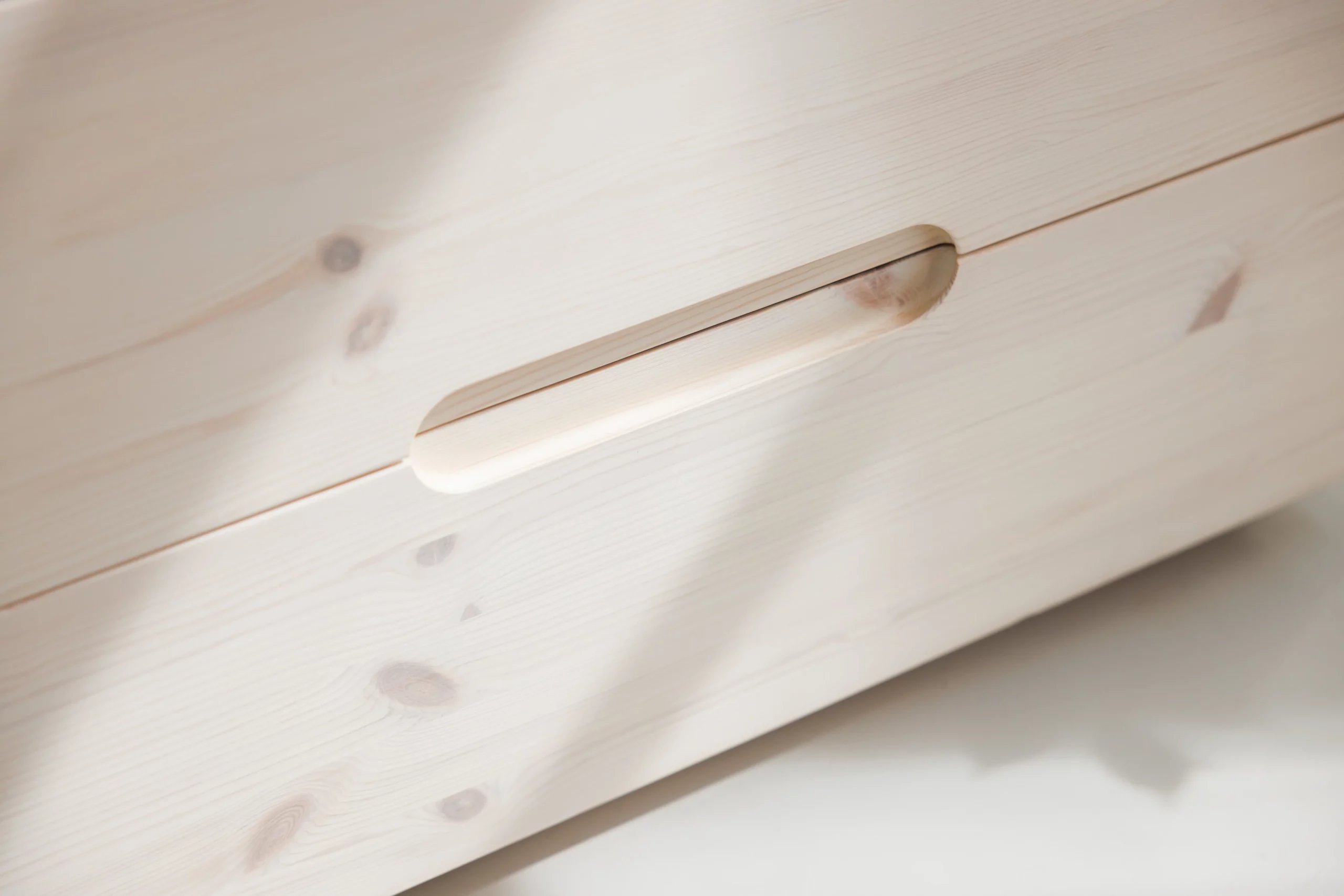 Die Kommode wird aus zertifiziertem massivem Kiefernholz gefertigt und mit einer ökologischen weißen Holzlasur behandelt, bei der die natürliche Maserung des Holzes leicht durchschimmert. Die Griffe werden dezent in das Holz gefräst. Das skandinavisch anmutende Design passt eigentlich in jede Schlafzimmer Umgebung, besonders gut aber zu den weißen ekomia Betten.
