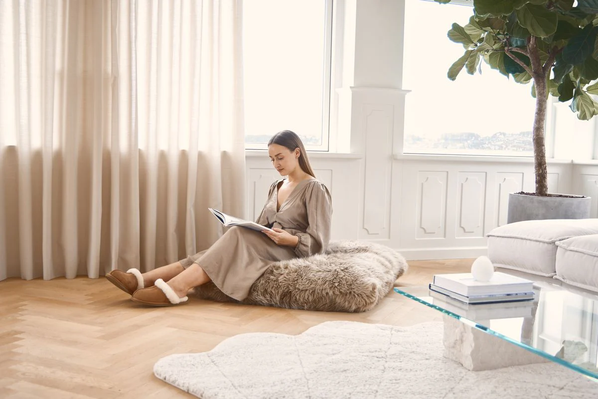 Diese kuscheligen Hausschuhe sind aus neuseeländischem Schaffell gefertigt und passen zu jeder Gelegenheit, bei der man das gewisse Extra an Gemütlichkeit und Wärme benötigt. Die Schuhe sind innen mit weichem Schaffell gefüttert und die Außenseite besteht aus Wildleder, das in der Mitte zusammengenäht ist.