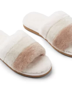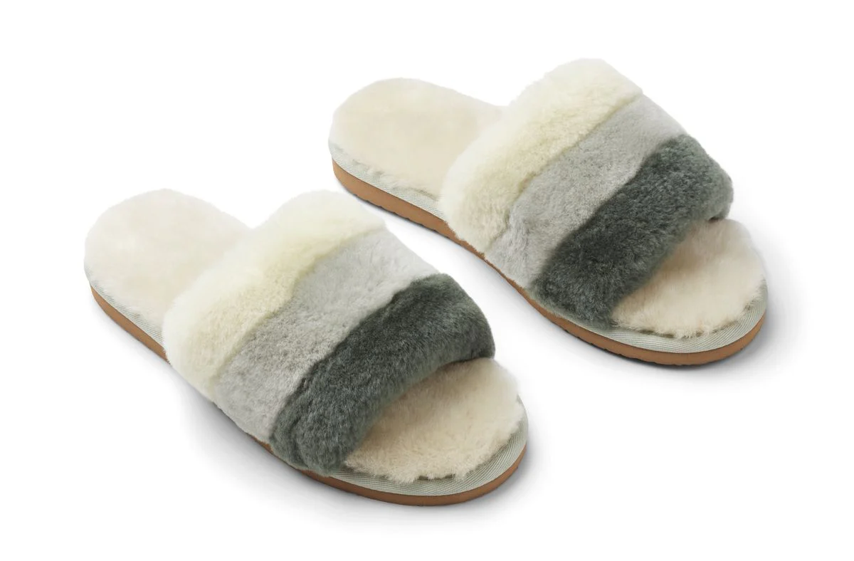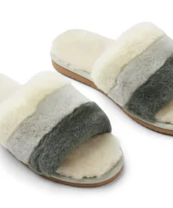 Diese ultra-weichen Hausschuhe sind aus neuseeländischem Schaffell gefertigt, das einen natürlichen Glanz hat. Die Hausschuhe haben einen breiten Riemen, der sich perfekt um den Fuß schmiegt. Der Riemen besteht aus drei Fellstücken in drei verschiedenen Farbtönen.