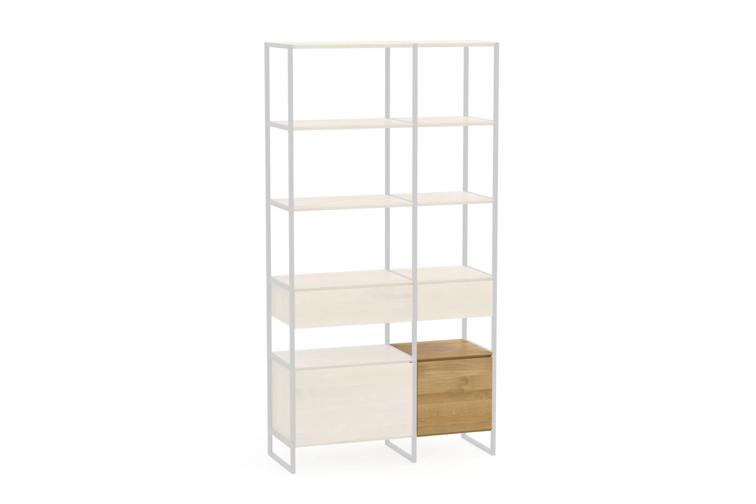 Dies ist ein Türenmodul für das Regal Wega (Breite: 40 cm, Tiefe: 40cm | Innenmaß 36 x 34 x 36 cm). Die Türen schließen mit Soft-Close Mechanik und können zur Öffnung in beide Richtungen montiert werden.