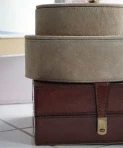 Bringen Sie ein bisschen extra Stil in Ihre Organisation Zuhause mit diesem Set aus zwei runden Boxen in zwei Größen. Die Kästchen sind aus hochwertigem Kalbsleder hergestellt, das besonders haltbar ist. Das Leder stammt aus Südamerika und ist dank der hohen Qualität nicht nur haltbar, sondern auch weich und geschmeidig.