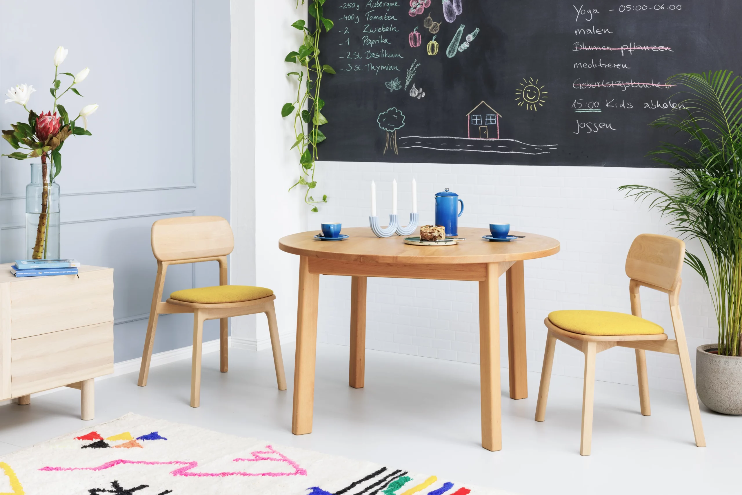 Bestelle den runden Esstisch Form F in einer Holzart deiner Wahl. Durch die große Tischfläche entstehen einzigartige und beeindruckende Maserungen. Das zertifizierte Massivholz wird neben den stabilisierenden Zargen auf der Unterseite mit Gratleisten aus Metall verstärkt, damit die Tischplatte schön gerade bleibt.