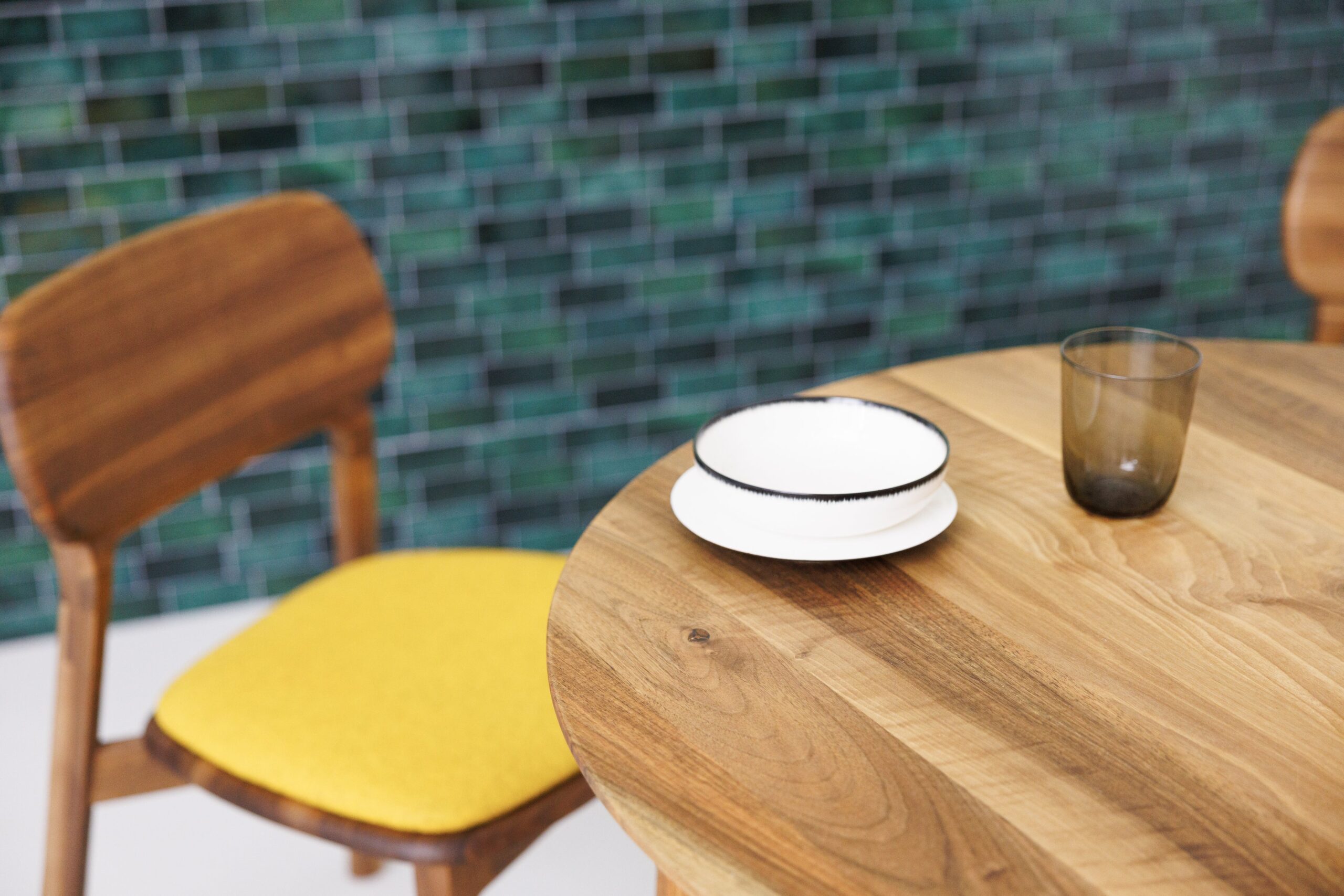 Die leicht gekippten runden Holzbeine verjüngen sich leicht zum Boden hin und sind mit den Tischzargen über ein “Glattes Eckblatt” mit sichtbaren Holzdübeln verbunden. Der Spalt gibt dem Tisch eine fast schwebende Leichtigkeit, die von der schmalen Schweizer Kante besonders hervorgehoben wird.