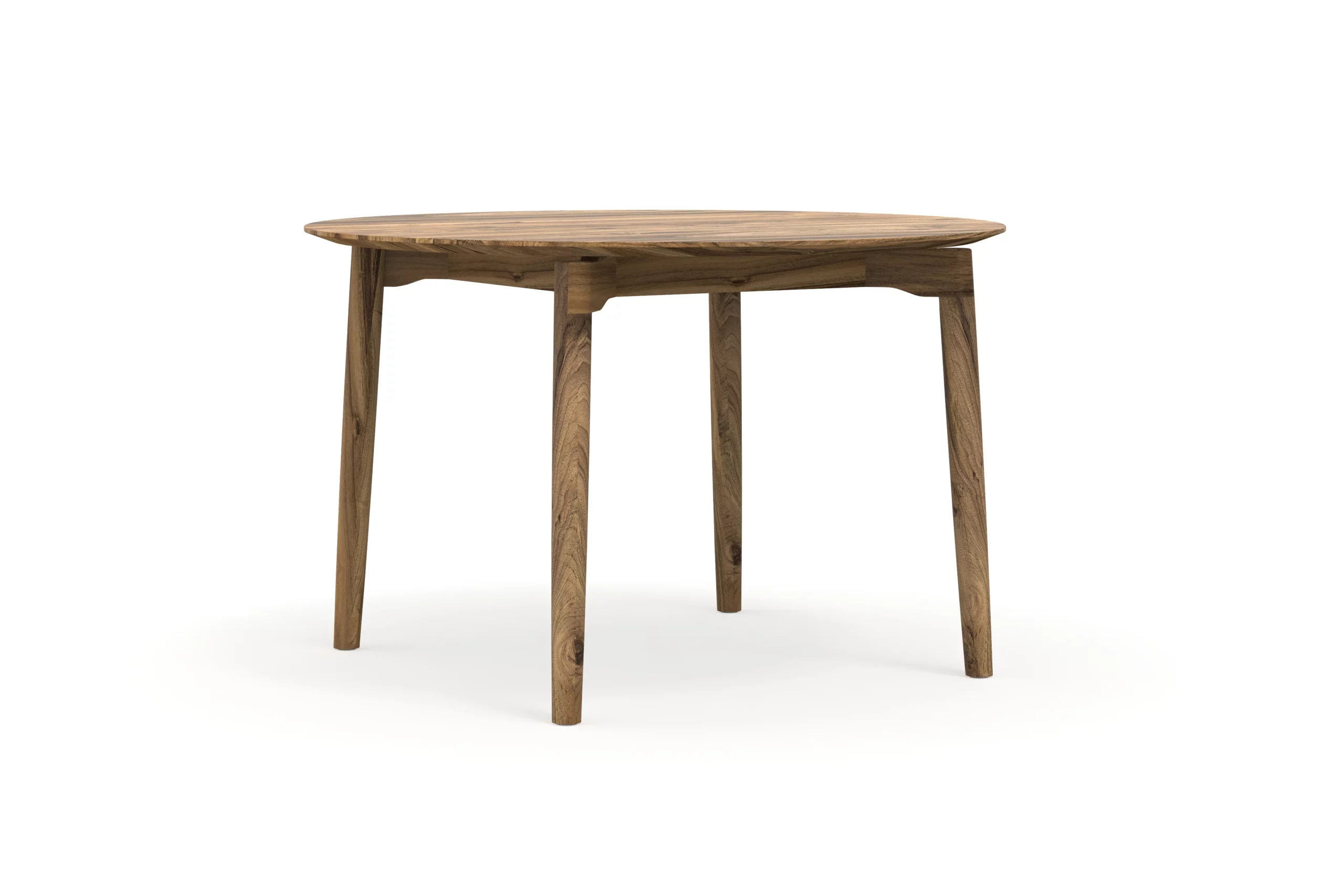 Die leicht gekippten runden Holzbeine verjüngen sich leicht zum Boden hin und sind mit den Tischzargen über ein “Glattes Eckblatt” mit sichtbaren Holzdübeln verbunden. Der Spalt gibt dem Tisch eine fast schwebende Leichtigkeit, die von der schmalen Schweizer Kante besonders hervorgehoben wird.