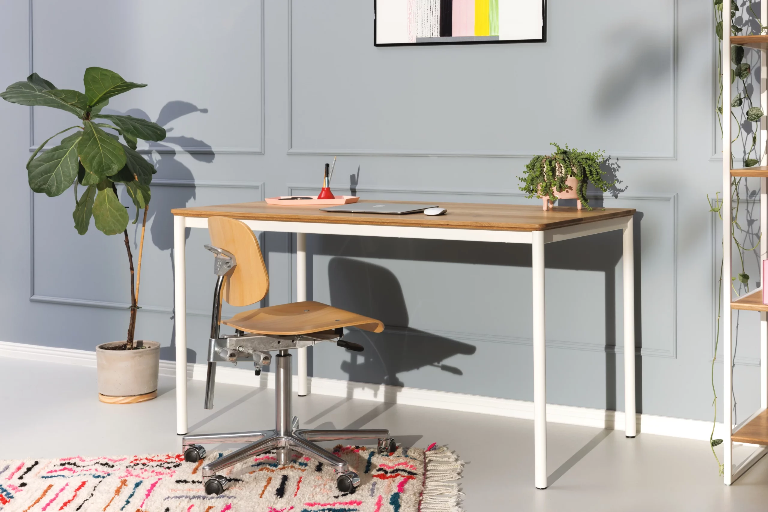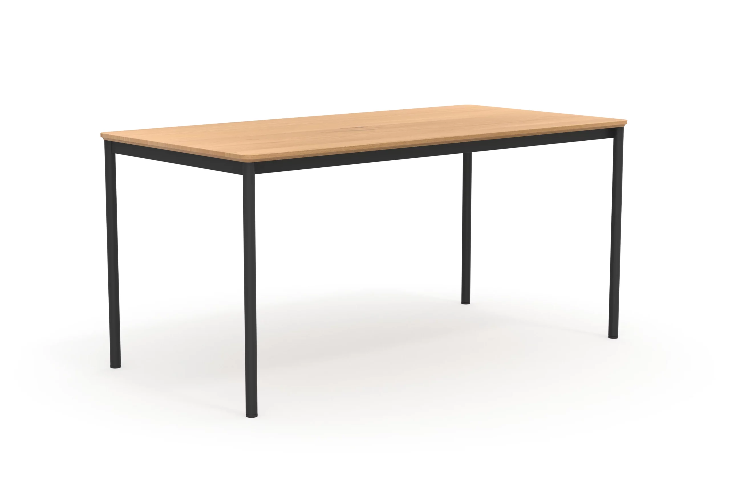 Mira ist ein simpler aber zeitlos schöner Schreibtisch. Die runde gefräste Tischkante fließt gleichmäßig in die runden Tischbeine. Trotz schmaler Tischplatte und schlanker Beine ist Mira dank der Kombination aus Metall und Massivholz praktisch unverwüstlich.