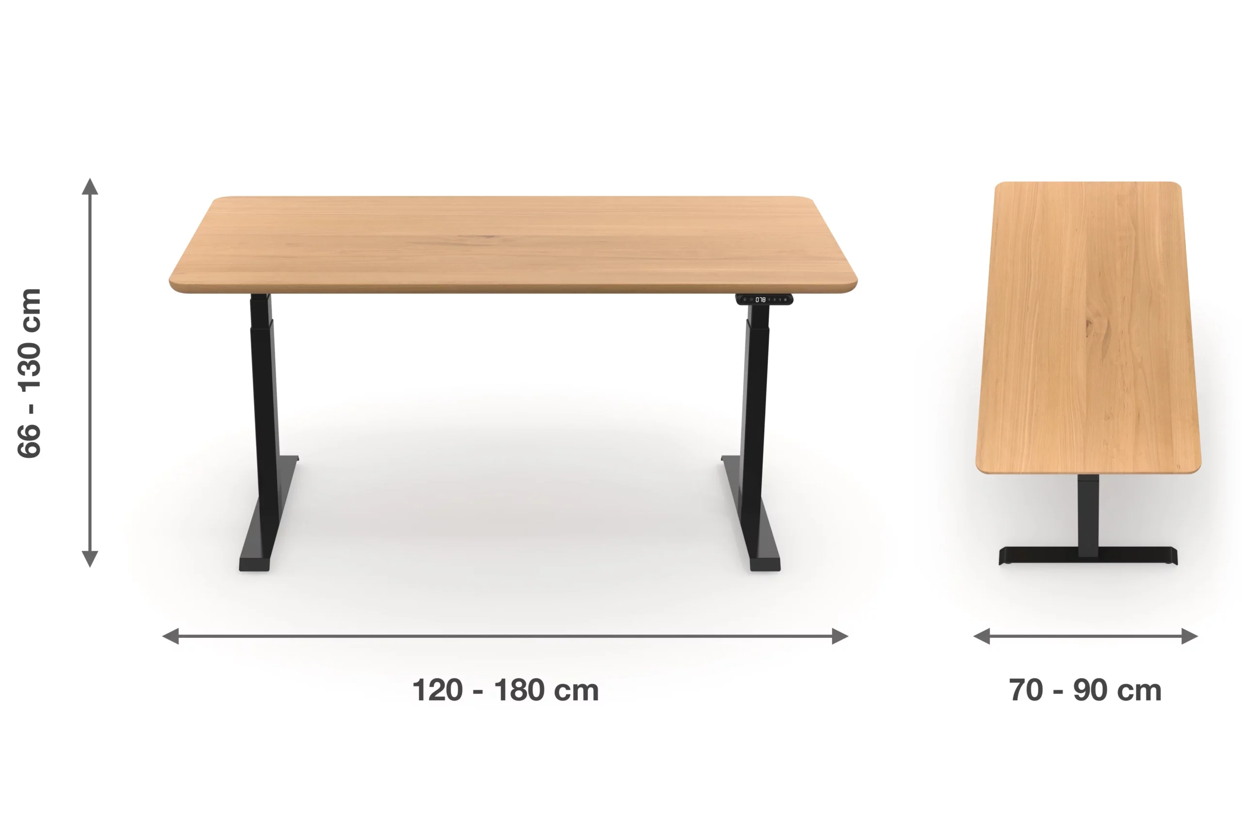 Das Tischgestell ist aus stabilem Stahl gefertigt und kann ein Gewicht von 100kg (inklusive Tischplatte) ohne Probleme heben. Die Höhe lässt sich von 66 bis 130cm einstellen. Damit können sowohl Schulkinder an dem Tisch sitzen als auch große Menschen am Tisch stehen.
