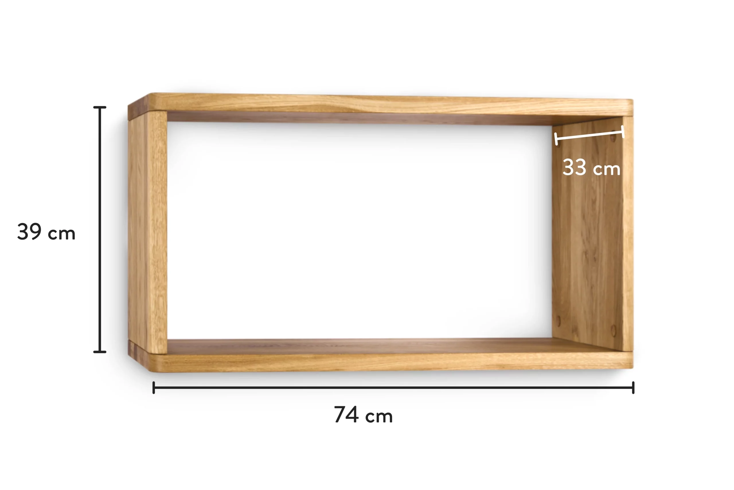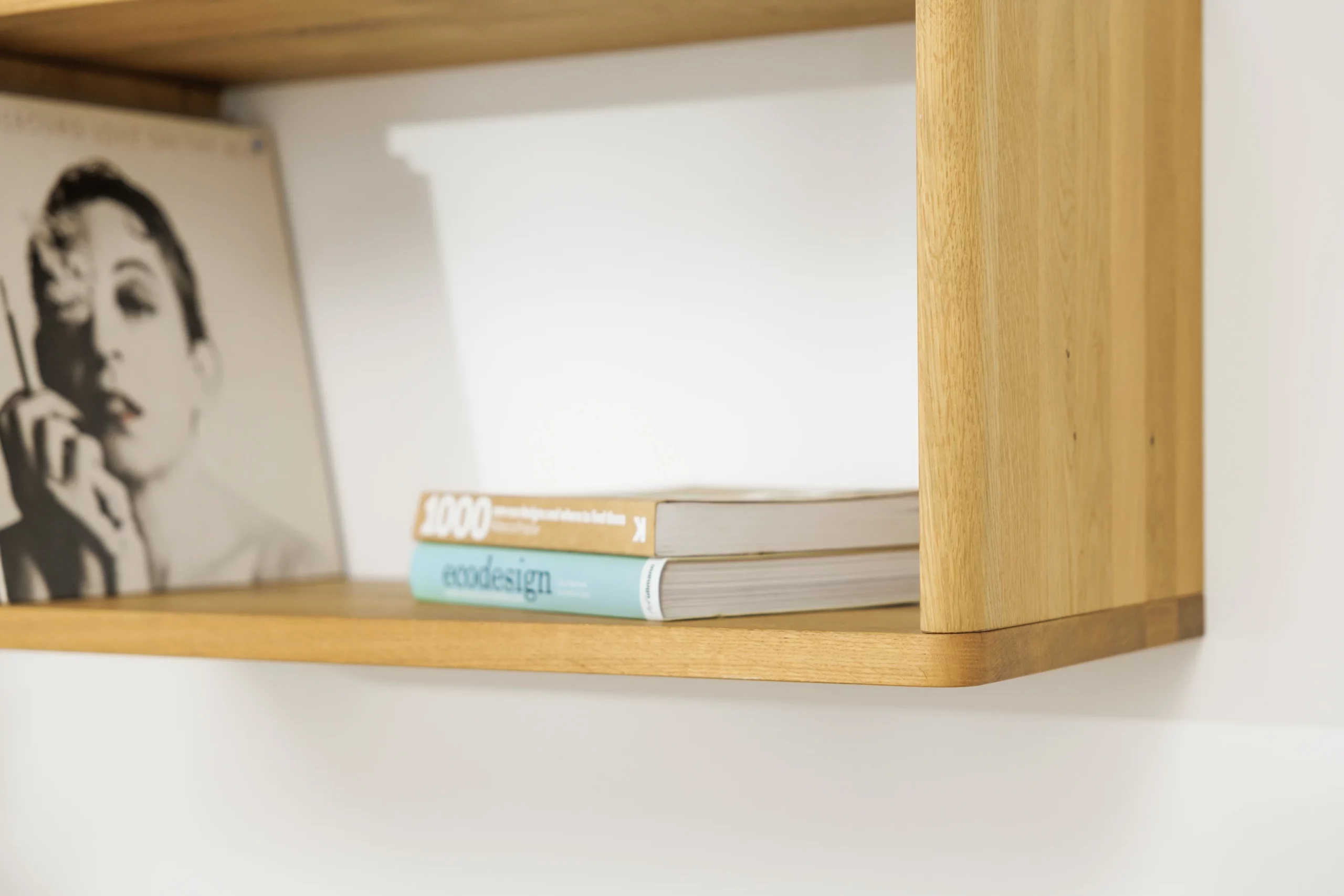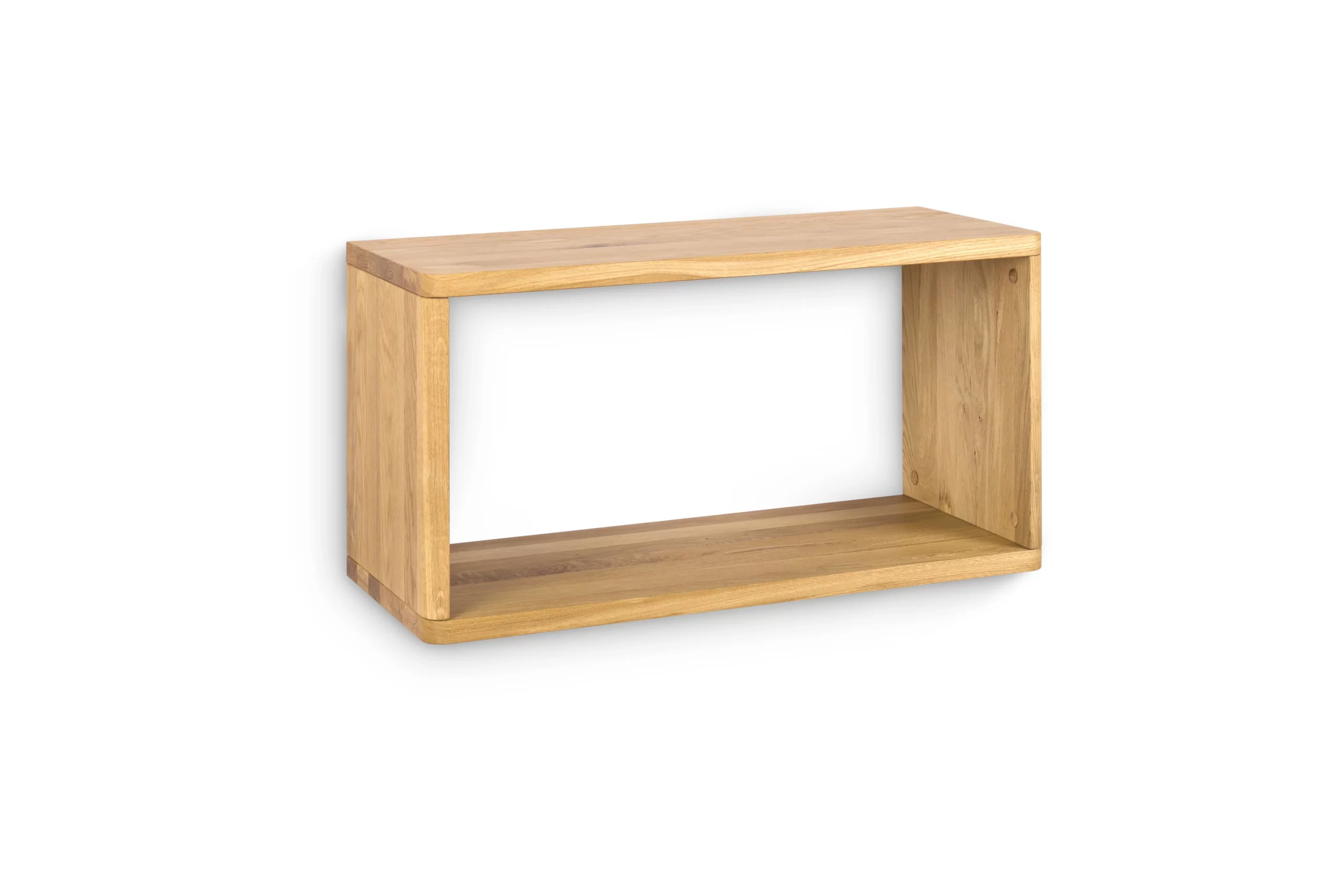 Das Wandregal wird aus ausgewählter Eiche gefertigt. An manchen Stellen sind sauber bearbeitete Aststellen sichtbar. Die Maserung ist bei jedem Stück anders und macht jedes Wandregal zu einem Unikat.
